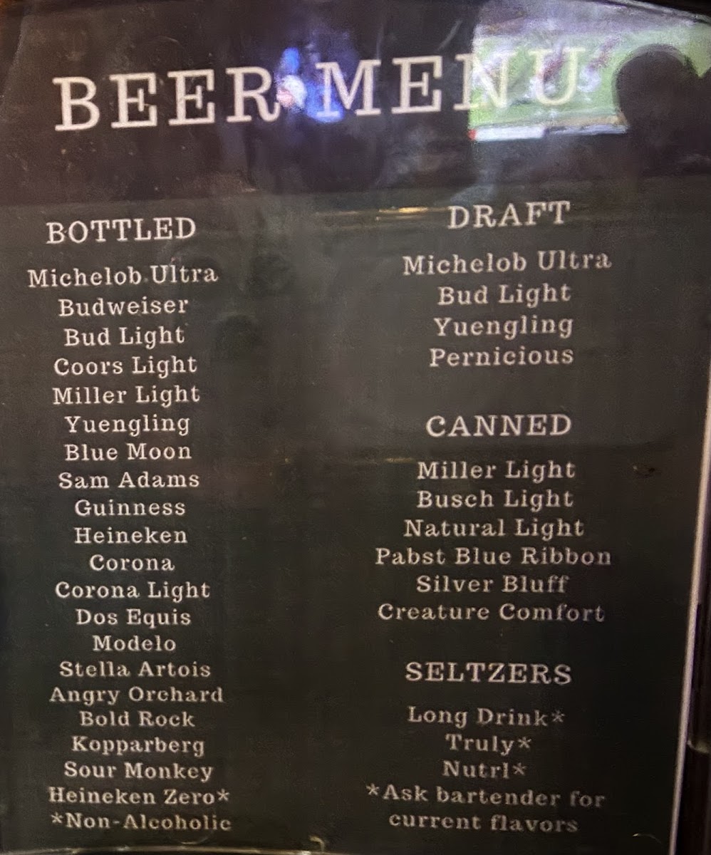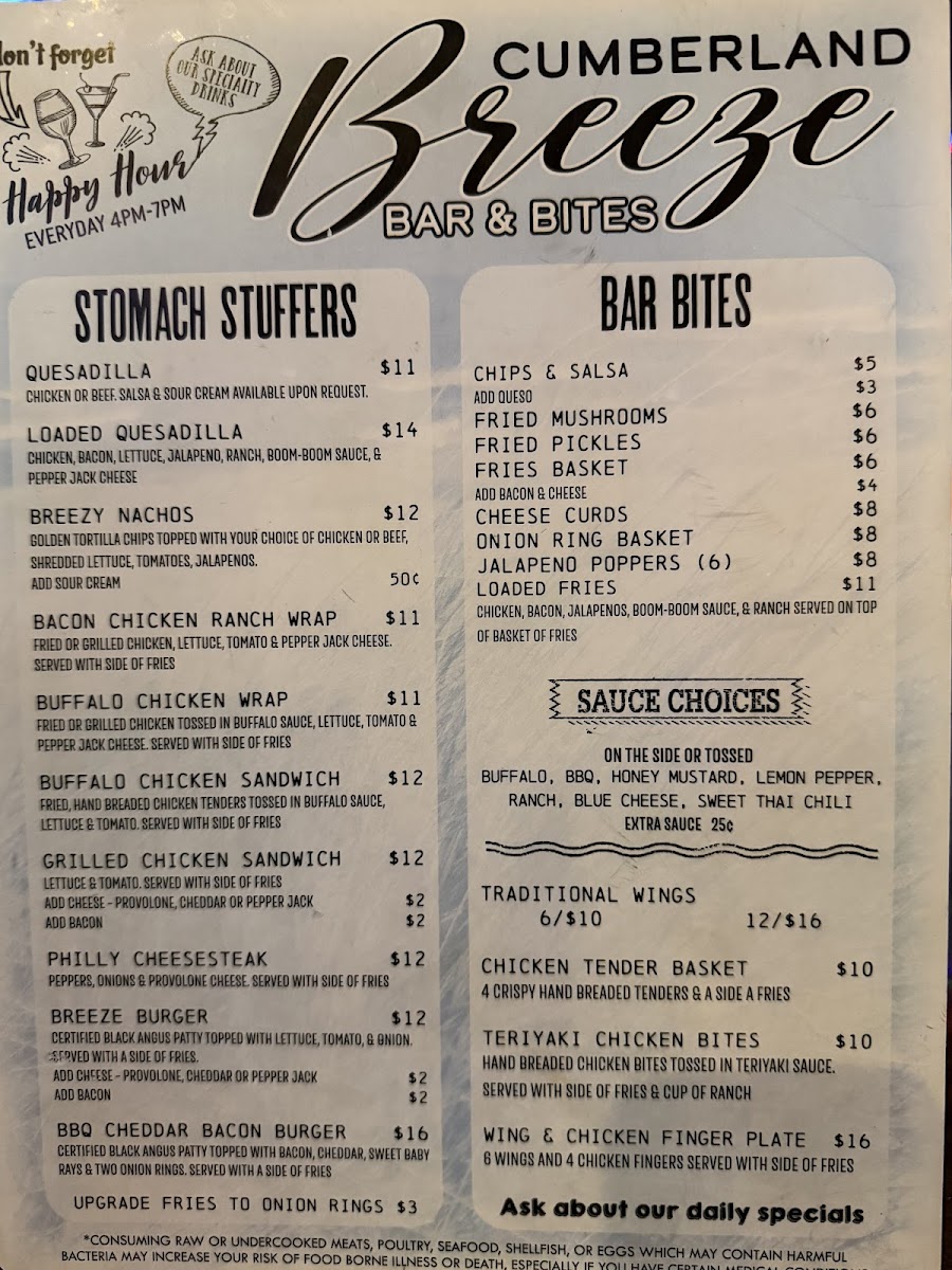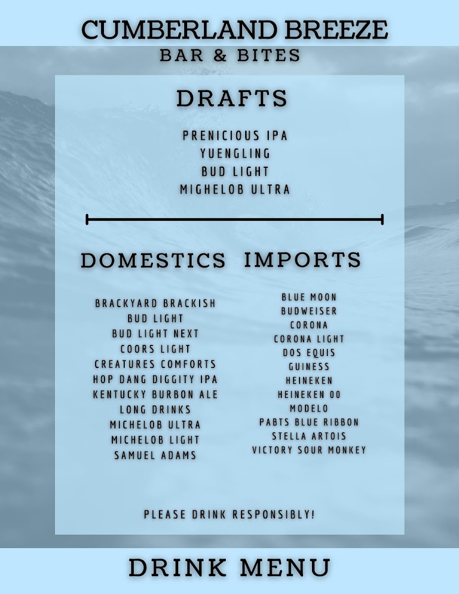 From a reviewer’s perspective, the menu at Cumberland Breeze offers a laid-back, pub-style selection that focuses on satisfying comfort bites and familiar favorites rather than an extensive or upscale spread. The “Stomach Stuffers” section stands out with hearty options like the Quesadilla, the indulgent Bangin Breezy Sampler, and crowd-pleasers such as the Buffalo Chicken Wrap, Bacon Chicken Ranch Wrap, and Buffalo Chicken Sandwich, all of which lean into bold, savory flavors. On the drinks side, the draft list keeps things casual with staples like Prenicious IPA, Yuengling, Bud Light, and Michelob Ultra, while the domestics and imports lineup expands slightly with choices like Bud Light Next, Coors Light, Creatures Comforts, and Hop Dang Diggity IPA. To round things out, the “Others” section delivers classic bar snacks including Chips & Salsa, Fries Basket, Onion Ring Basket, Fried Mushrooms, and Fried Pickles, making it easy to mix and match small bites. While prices aren’t listed, the overall impression is of an approachable, no-frills menu that pairs well with drinks and a relaxed atmosphere, ideal for casual dining rather than a full culinary experience.